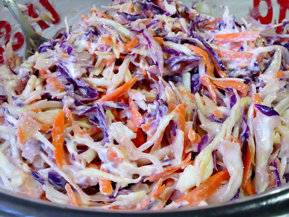 Για τη σαλάτα έτριψα το άσπρο και κόκκινο λάχανο, το καρότο έριξα λίγο αλάτι ελάχιστο ελαιόλαδο μία κουταλιά ξύδι και δυο-τρεις κουταλιές μαγιονέζα light.