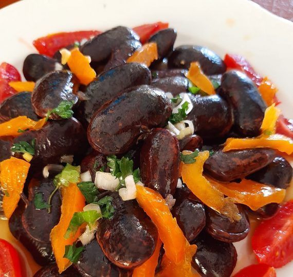 Σαλάτα με μαύρους γίγαντες . Συνταγή για σαλάτα με μαύρους γίγαντες Πρεσπών, χρωματιστές πιπεριές, κρεμμύδι φρέσκο, ντοματίνια και σώς γκρέιπφρουτ.