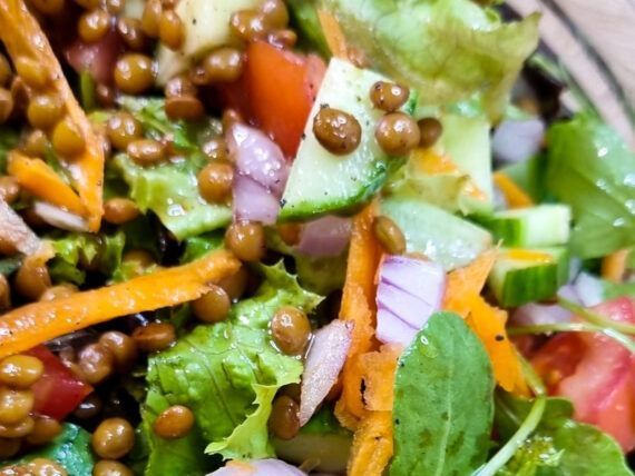 -180g boiled lentils -1 lola lettuce -1 cup arugula -1 diced tomato -1 grated carrot -1 dry onion, chopped -1 cucumber cut into cubes -4 tbsp olive oil -2-3 tbsp balsamic vinegar -Salt Pepper