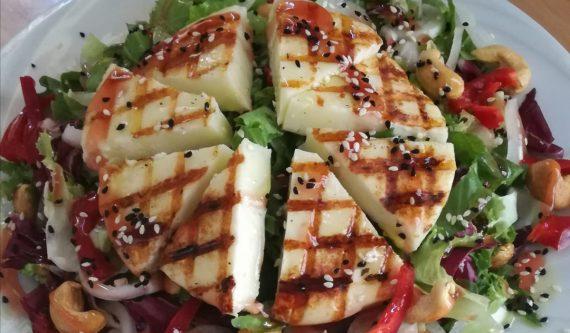 Βάζουμε στην άκρη τα λαχανικά μας και παίρνουμε το ταλαγάνι. Κόβουμε μία μερίδα φέτα ταλαγάνι για κάθε σαλάτα που θέλουμε να φτιάξουμε. Παίρνουμε ένα σχαροτήγανο και το αφήνουμε να κάψει καλά. Αφού κάψει βάζουμε το ταλαγάνι πάνω. Το ψήνουμε και από τις δύο πλευρές. Κάνουμε μόνο δυο γυρίσματα και το τυρί μας είναι έτοιμο.