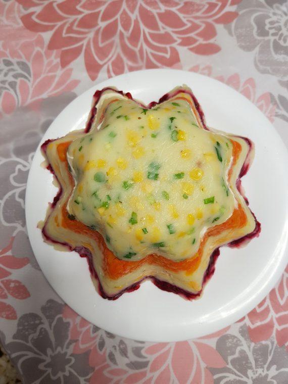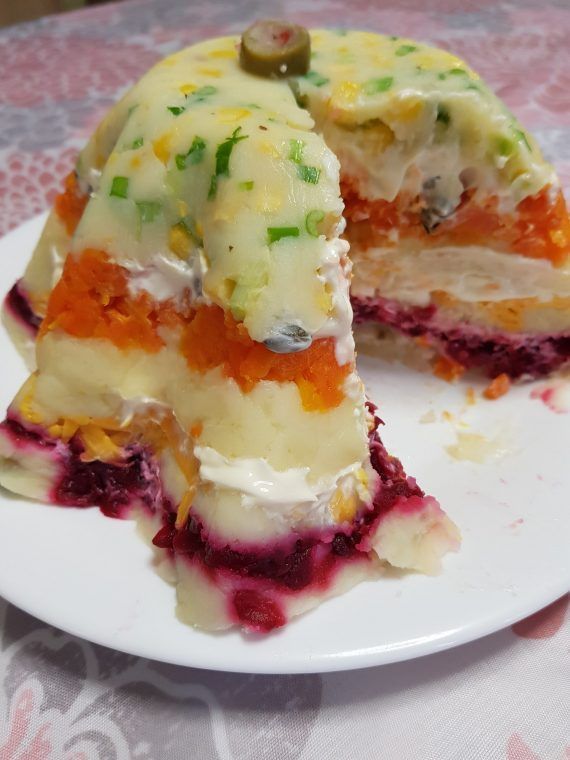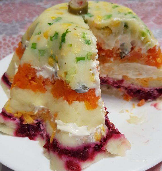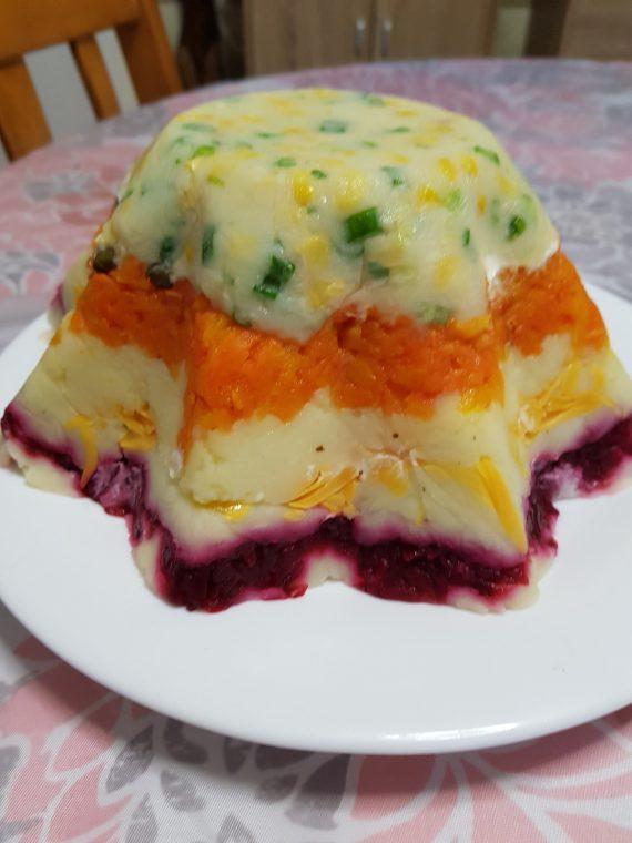 7.βάζουμε κάπαρη λίγη ακόμα πατάτα και τριμμένο τσενταρ, λίγη πατάτα, μαγιονέζα και τα παντζάρια πιέζοντας πάντα με κουτάλι (ΠΟΛΥ ΣΧΟΛΑΣΤΙΚΆ) να είναι ομοιόμορφο.