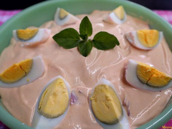 Βάζουμε την μαγιονέζα την κέτσαπ ανακατεύουμε και αρχίζουμε το στήσιμο. Ρίχνουμε το τυρί το ζαμπόν και από επάνω καλύπτουμε με την μαγιονέζα. Διακοσμούμε με τα αυγά και λίγα φύλλα φρέσκα ρίγανης.