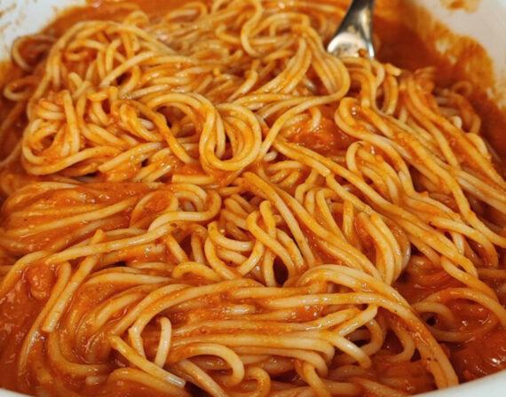 Στράγγισέ τα και κράτα 2-3 κουταλιές της σούπας νερό. Ρίξε τα λαχανικά που έβρασαν σε μπλέντερ και χτύπα τα μέχρι να γίνουν σάλτσα. Ρίξε τη σάλτσα και πάλι στο ταψάκι. Πρόσθεσε το νερό που κράτησες και ρίξε και τα σπαγγέτι μέσα. Ανακάτεψε και απόλαυσε.