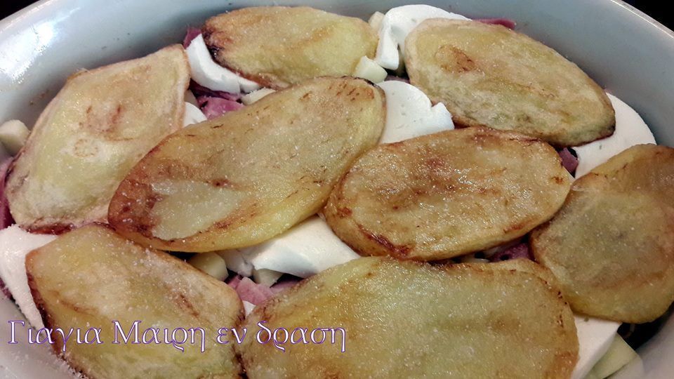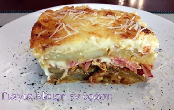 Κοτόπουλο by mairh Σας έχει μείνει κοτοπουλάκι κοκκινιστό??? Εδώ σας έχω μια ιδέα για ανακύκλωση γεμάτη γεύση Υλικά 2-3 μερίδες κοτόπουλο κοκκινιστό 4 πατάτες ροδέλες ψημένες η τηγανιτές 3 μελιτζάνες ψητές η’ τηγανίτες 10 φέτες μπέικον ψιλοκομμένο 150 γραμ κασέρι σε μικρούς κύβους 1 συσκευασία μοτσαρέλα 125 γραμ σε ροδέλες 1/2 δόση μπεσαμέλ