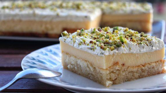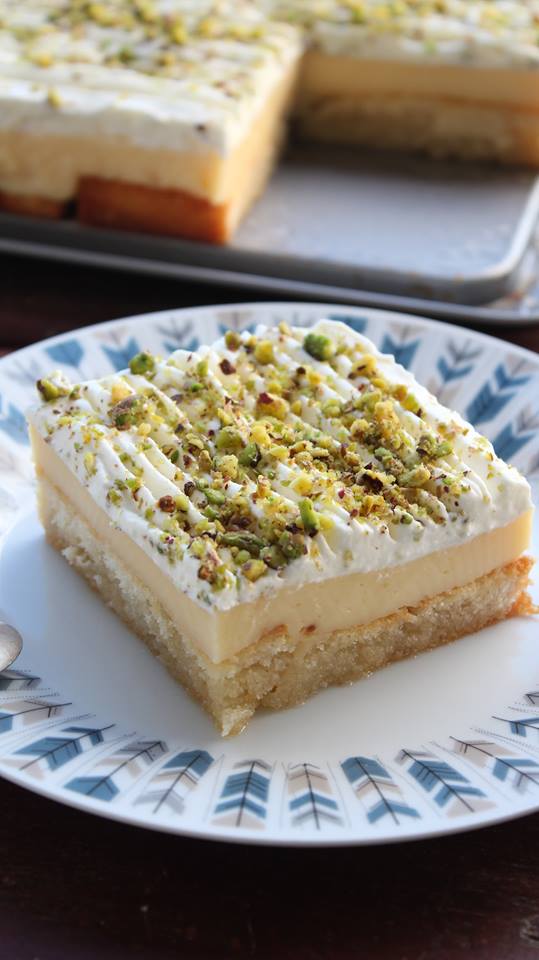 -100γρ. ζάχαρη (100gr. sugar) -40γρ. αλεύρι (40gr. flour) -40γρ. κορν φλάορ (40gr. cornstrach) -4 κρόκοι (4 egg yolks) -500γρ. γάλα (500gr. milk) -2 βανιλίνες (2 vanillins) -2 κ.σ. βούτυρο (2 tbsp. butter) -100γρ. γάλα επιπλέον (100gr. more milk) -250γρ. φυτική σαντιγύ (250gr. vegetable whipped cream) -φιστίκια Αιγίνης (some grated pistachios)