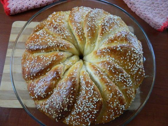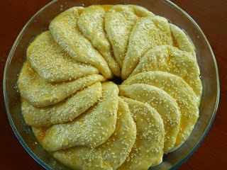 Σκεπάστε και αφήστε να φουσκώσει για 30 λεπτά, στη συνέχεια αλείψτε με χτυπημένο κρόκο αυγού και πασπαλίζουμε με σουσάμι .