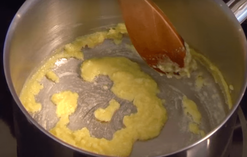 1. Αρχικά φτιάξτε την μπεσαμέλ. Πάρτε ένα μέτριο τηγάνι και λιώστε το βούτυρο σε μέτρια φωτιά. Βάλτε το αλεύρι και ανακατέψτε μέχρι να γίνει λεία. Συνεχίστε να ανακατεύετε μέχρι να πάρει ένα χρυσαφί χρώμα, για περίπου 6 ή 7 λεπτά.