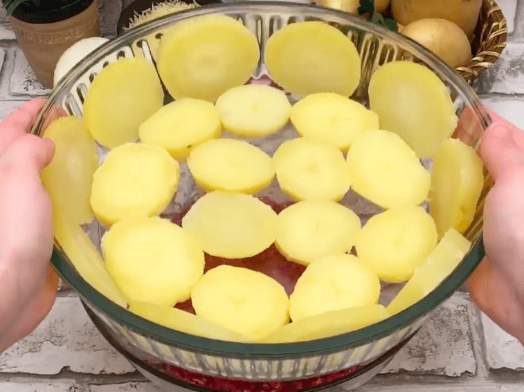 4. Μετά, ξεφλουδίστε τις πατάτες και βράστε τις μέχρι να γίνουν σχετικά μαλακές, περίπου για 7 λεπτά. Αφού βράσουν, κόψε τις σε φέτες και βάλτε τις στον πάτο ενός πυρέξ. Βάλτε ένα στρώμα στον πάτο και άλλο ένα στα τοιχώματα.