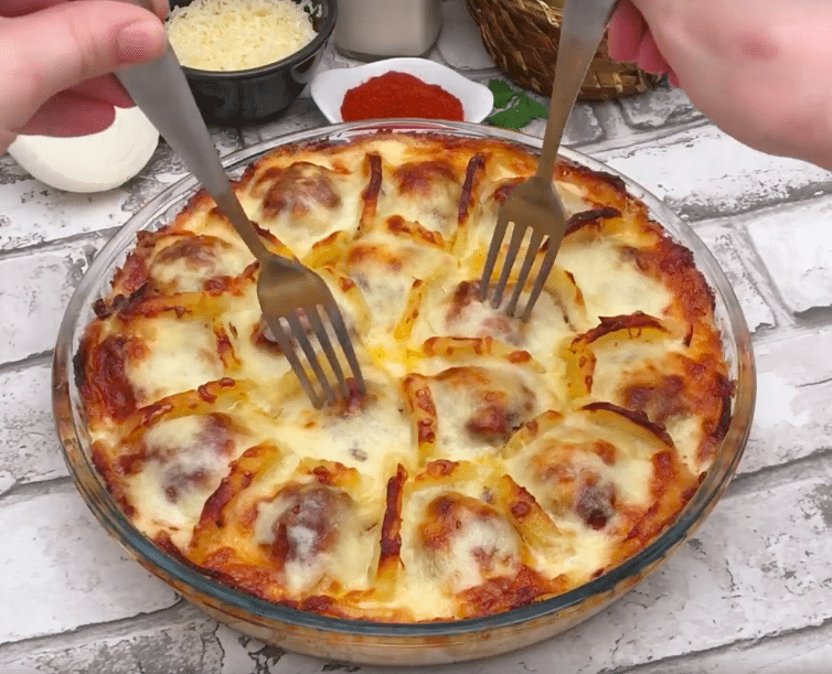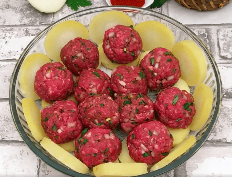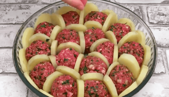 5. Μετά, βάλτε μέσα τους κεφτέδες, έναν πάνω σε κάθε φέτα πατάτες που είχατε βάλει νωρίτερα.