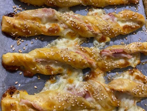 Από πάνω καλύπτουμε με την δεύτερη σφολιάτα και κόβουμε σε λωρίδες. Έπειτα γυρίζουμε τις λωρίδες και αλείφουμε με το χτυπημένο αυγό. Πασπαλίζουμε με σουσάμι και ψήνουμε σε προθερμασμένο φούρνο, στους 180 βαθμούς Κελσίου, στις αντιστάσεις μέχρι να ροδίσουν καλά.