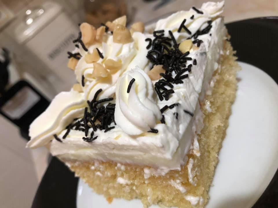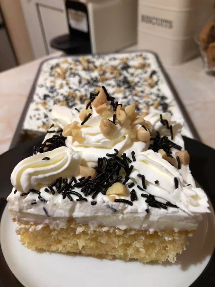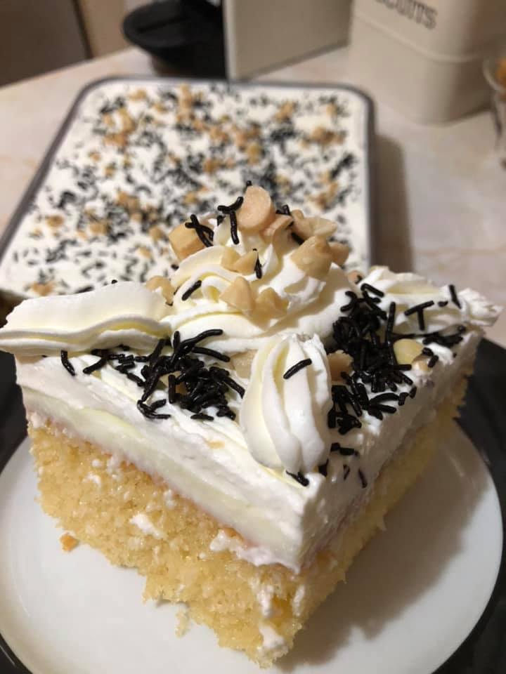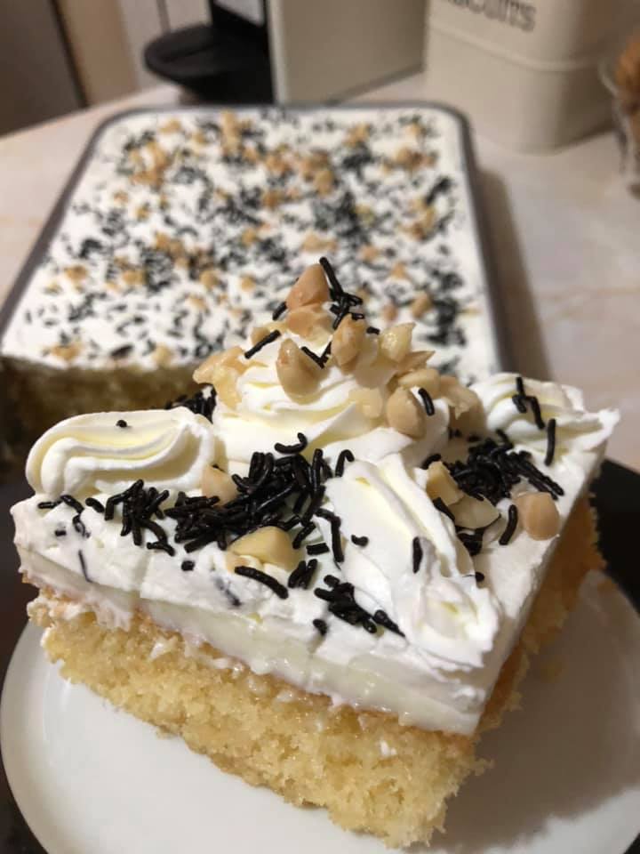 Στο μεταξύ φτιάχνω την σαντιγί και την βάζω στο ψυγείο να παγώσει. Όταν το γλυκό έχει κρυώσει εντελώς απλώνω επάνω την σαντιγί. Πασπαλίζω με αμύγδαλα ή με ότι άλλο θέλω και είναι έτοιμο το γλυκό μας! *Tο ταψάκι μου, είναι 34x24cm