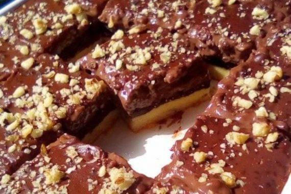 Ανακατεύουμε καλά μέχρι να γίνει λείο το μείγμα μας και το ρίχνουμε πάνω από το γλυκό μας. Στο τέλος γαρνίρουμε με καρύδια και λίγη σοκολάτα, αν θέλουμε.