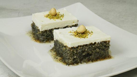 250 γρ φαρίνα 370 γρ ζάχαρη 400 ml σπορέλαιο 320 γρ σιμιγδάλι χονδρό 200 γρ παπαρουνόσπορο 10 γρ μπέικιν 3 βανίλιες Σιρόπι 500 γρ ζάχαρη 700 ml νερό 2 βανίλιες 400 ml κρέμα γάλακτος