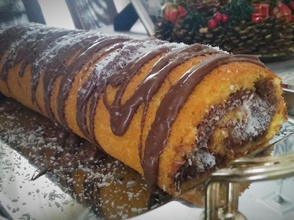 Βράζω το σιρόπι μου μαζί όλα τα υλικά για 2 λεπτά. Σιροπιάζω το παντεσπάνι μου και αλείφω όλη την επιφάνεια με πραλίνα φουντουκιού. Πασπαλίζω με μπόλικη καρύδα και ρολάρω. (Αν δεν σας απλώνει καλά η πραλίνα μπορείτε να τη βάλετε για μισό λεπτό μέσα στο φούρνο μικροκυμάτων). Διακοσμώ με πραλίνα και καρύδα.