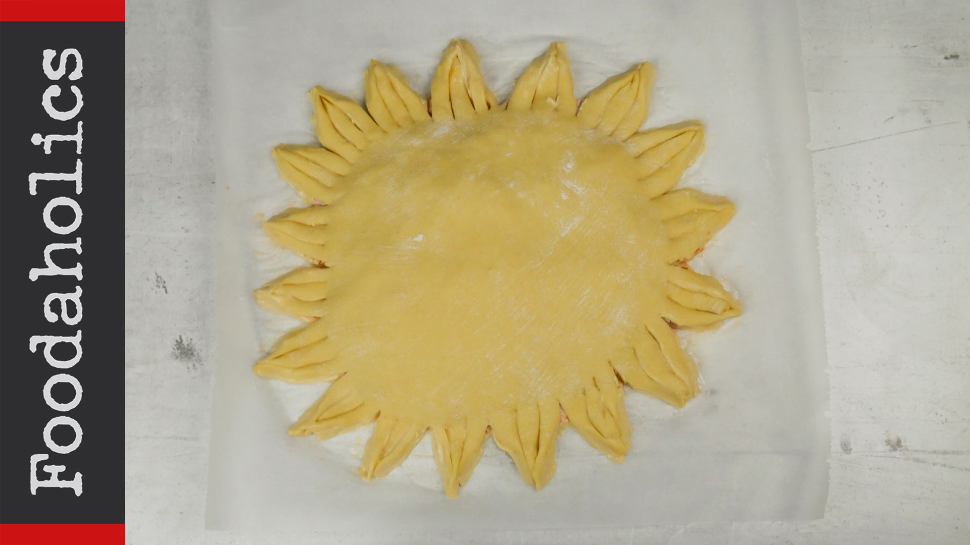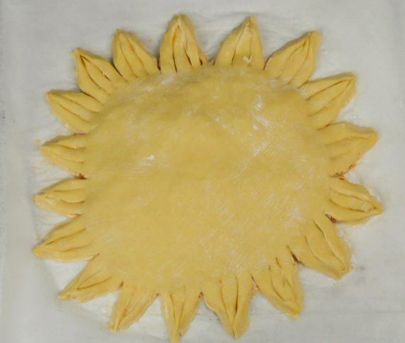 Αναμειγνύουμε το γιαούρτι με τα αυγά, το ελαιόλαδο, το μπέικιν και λίγο αλάτι. Προσθέτουμε το αλεύρι και δουλεύουμε να γίνουν ζύμη. Την χωρίζουμε σε δύο μέρη και τα ανοίγουμε σε φύλλα. Στην σάλτσα ντομάτας βάζουμε ρίγανη και την απλώνουμε στο ένα φύλλο. Τοποθετούμε αλλαντικά, τριμμένο κίτρινο τυρί και σκεπάζουμε με το άλλο φύλλο. Περιμετρικά κόβουμε ακτίνες και τις ενώνουμε ανά τρεις. Αλείφουμε με κρόκο αυγού και ψήνουμε στους 180 βαθμούς μέχρι να ροδίσει.