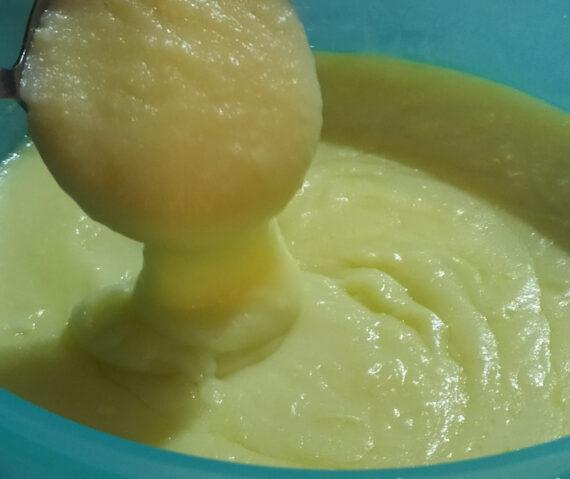 Επίσης προσθέτουμε το ζεστό νερό που έβρασαν οι πατάτες. Χτυπάμε πολύ καλά τα υλικά μας και αφού ομογενοποιηθούν και γίνουν πουρές, δοκιμάζουμε κι αν λείπει κάτι, συμπληρώνουμε.