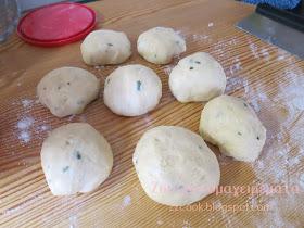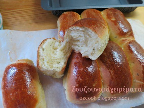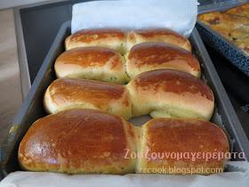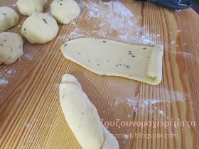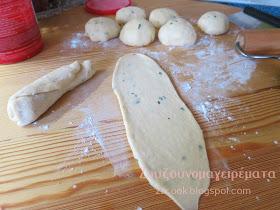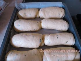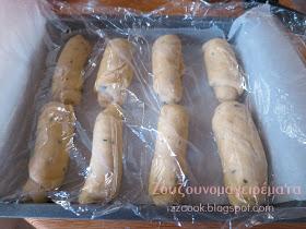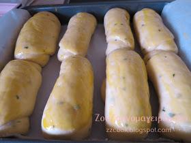 Ανοίγουμε σε μακρόστενες λωρίδες τα ζυμαράκια. Τα τυλίγουμε σε ρολά και τα τοποθετούμε σε ταψάκι με λαδόκολλα. Σκεπάζουμε και αφήνουμε να φουσκώσουν 30 λεπτά.