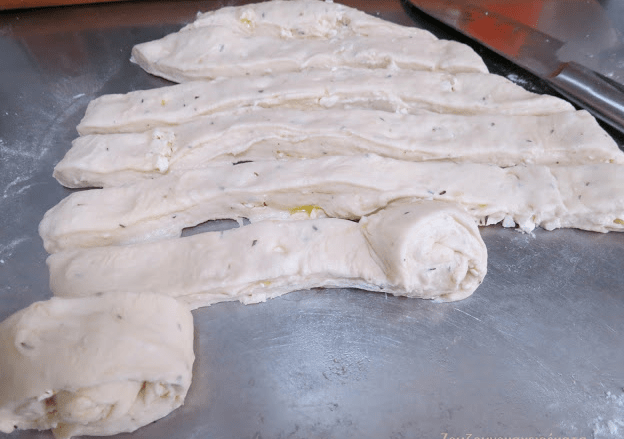 Την πατάμε να ανοίξει τη λαδώνουμε λίγο και απλώνουμε το τυρί. Κάνουμε ένα ρόλο πάντα με τα χέρια βέβαια σαν να θέλουμε να κλείσουμε ένα φάκελο. Ανοίγουμε τη ζύμη σε ένα φύλο 20χ30 περίπου και την κόβουμε σε λωρίδες 2 εκατοστών.