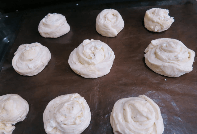 Τυλίγουμε τις λωρίδες δημιουργώντας ένα όμορφο λουλουδάκι, τα τοποθετούμε σε ταψί με λαδόκολλα. Τα σκεπάζουμε με μεμβράνη και περιμένουμε να φουσκώσουν 30 λεπτά περίπου.