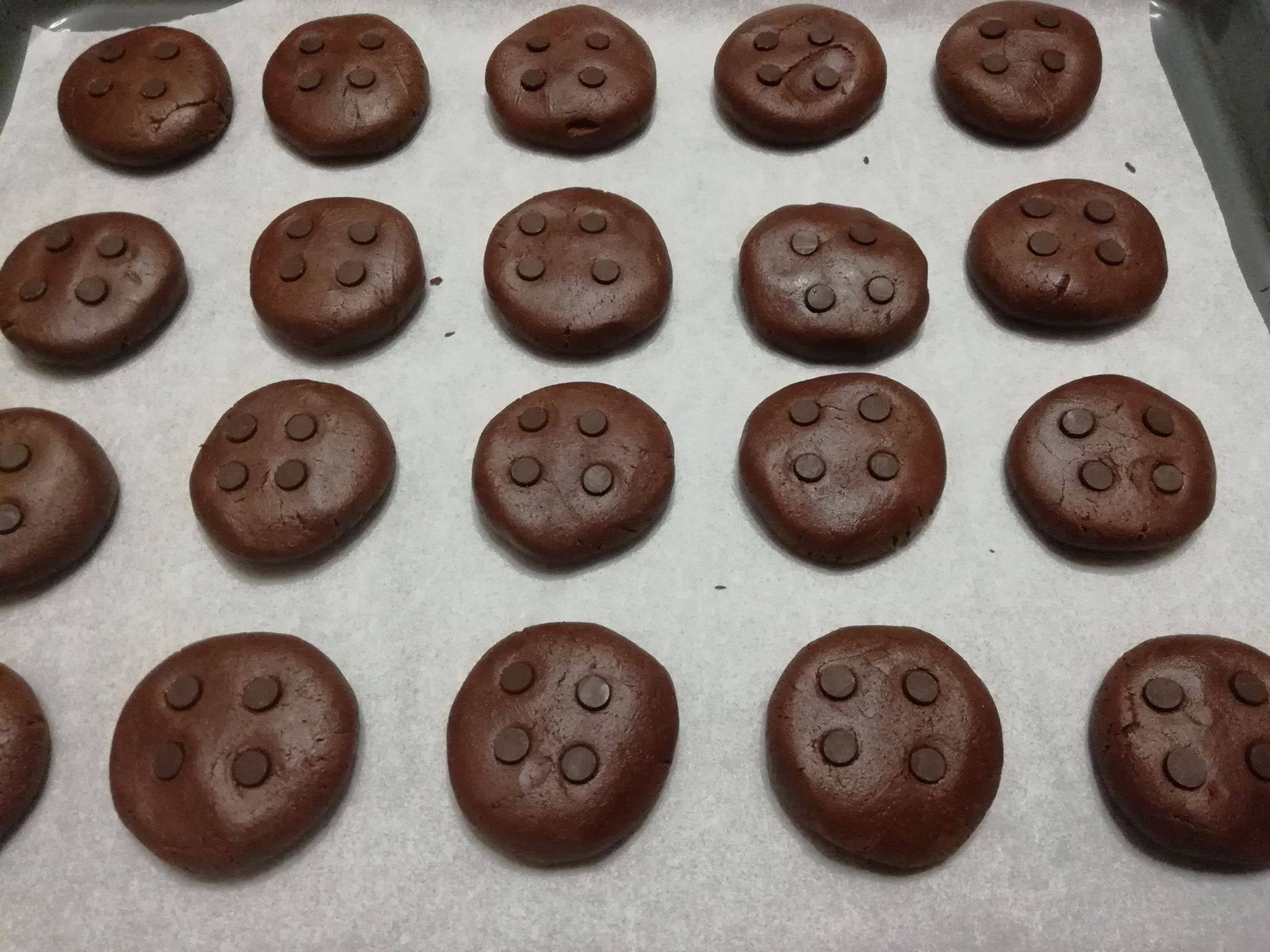 Συνταγή : 250γρ. βιτάμ 1 ποτήρι ζάχαρη κρυσταλλική 2 μεσαία αβγά 1 πρέζα αλάτι ψιλό 1 βανιλίνη 1 κουταλάκι γλυκού Baking powder Κακάο σκόνη τόσο ώστε να γίνουν όσο σκούρα θέλετε Αλεύρι για όλες τις χρήσεις τόσο ώστε να έχετε μια εύπλαστη και μαλακή ζύμη που δεν κολλάει στο χέρι Σταγόνες σοκολάτας για διακόσμηση