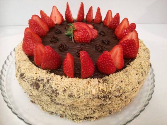 • Συνεχίζουμε με άλλο ένα παντεσπάνι (το μεσαίο) που το ραντίζουμε όμοια με το σιρόπι και προσθέτουμε τις φράουλες. Απλώνουμε μια άλλη δόση κρέμας.