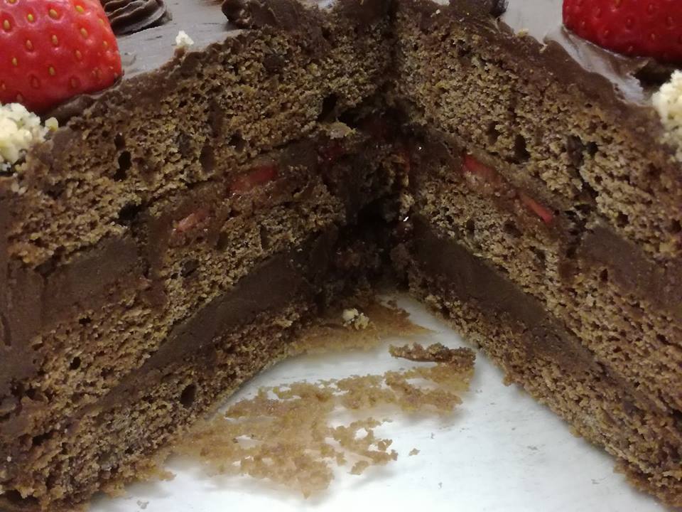 Μμμμμμ!!!!!!!!!!!!!!! Ναιιιιιιιιιιιιιιιι!!!!!!! Tα καταφέραμε. Σοκολασμένη τούρτα φράουλα ΧΩΡΙΣ ίχνος λαδιού. Είτε νηστεύετε είτε όχι, είτε είστε vegan είτε όχι αυτή η ανάλαφρη τούρτα θα σας ενθουσιάσει… ΥΛΙΚΑ Για το παντεσπάνι • 1 μεγάλο ώριμο αβοκάντο • 1 και ½ κούπες ζάχαρη κρυσταλλική • 1 και ½ κούπες χλιαρό νερό • 1 και ½ κ.γλ. μπέικιν πάουντερ • 2 κ.σ. κακάο • 1/2 κούπα σταγόνες σοκολάτα κουβερτούρα • 1 κόκκινη φαρίνα (500 γρ.) • Μερικές σταγόνες σιρόπι βανίλια • Λαδόκολλα για το ταψί και ένα πλαστικό