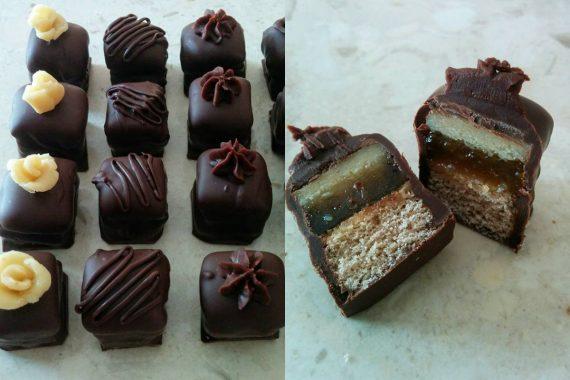 Συνταγή για γεμιστά σοκολατάκια με αμυγδαλόπαστα (μάρζιπάν) μπαχαρικά ,ζελέ και μια τραγανή βάση σαν μπισκότο.