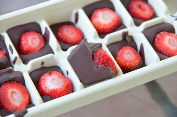 Εκτελεση Κόβετε τις φράουλες στην μέση ,αφού τις έχετε καθαρίσει από το κοτσανάκι της,λιώνετε την σοκολατα σε μπεν μαρί και παίρνετε μια παγοθήκη. Βάζετε μισή φράουλα σε κάθε θήκη και ρίχνετε μέσα την λιωμένη κουβερτούρα.