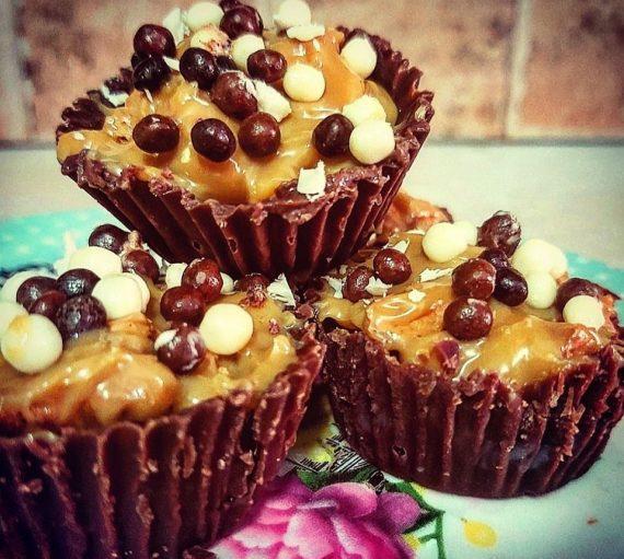 Τέλος σπάμε σε πολύ μικρά κομμάτια λίγα μπισκότα και τα ανακατεύουμε με το καραμελωμένο ζαχαρούχο γάλα και γεμίζουμε τις σοκολατένιες θήκες. Έτοιμα!