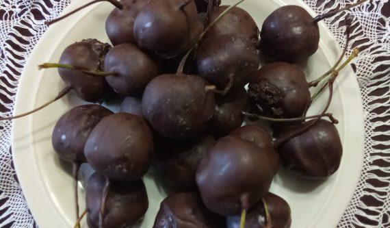 Ακουμπάμε τα σοκολατένια κεράσια σε ένα ταψί με λαδόκολλα και τα αφήνουμε να παγώσουν. Απολαμβάνουμε.