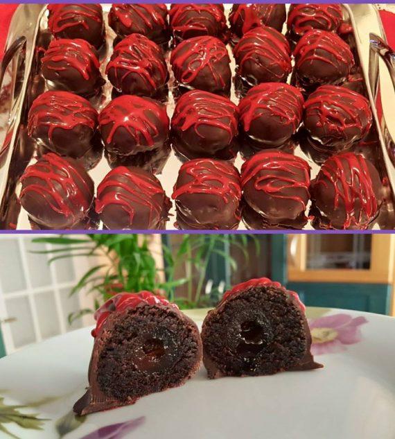 Μολις κρυωσει το διαλύουμε με τα χέρια μας η με ενα πιρούνι. Προσθέτουμε 3 – 4 κ.σ. Μερέντα και ζυμώνουμε για να πάει παντου μεχρι να γίνει μια ζύμη που μπορεί να πλαθει. Παίρνουμε με το κουτάλι μια ποσότητα την ανοίγουμε πάνω στην παλάμη μας και βαζουμε στο κέντρο ενα κερασι. Κλείνουμε δημιουργώντας ένα μπαλάκι. Επαναλαμβάνουμε μεχρι να μας τελειώσει το κεικ μας. Τα τοποθετουμε στο ψυγειο να παγώσουν για 1 ώρα. Στο μεταξύ λιωνουμε την κουβερτουρα και την αφηνουμε να χλιαρεψει. Βγάζουμε τις σοκολατενιες μπάλες μας από το ψυγείο. Παίρνουμε μια – μια Και τις βουτάμε στην σοκολατα γυρνώντας τες απο ολες τις πλευρες για να πάει παντου … Τις βαζουμε σε μια λαδόκολλα για 1-2 ωρες να παγώσουν… Τέλος τις γαρνιρουμε με οτι θελουμε… Εγώ ελιωσα Άσπρη κουβερτουρα, την χρωματισα με κόκκινο χρωμα και εκανα διαφορα σχέδια με ενα πιρούνι….