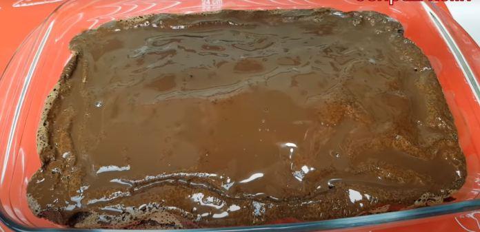 Σε ένα κατσαρολάκι ρίχνουμε το κακάο, το γάλα, και τη ζάχαρη. Το βάζουμε σε μέτρια φωτιά, ανακατεύουμε και το αφήνουμε να βράσει. Αφαιρούμε από το φούρνο το κέικ, το αναποδογυρίζουμε στο πάγκο αφαιρούμε την λαδόκολλα και το ξαναβάζουμε μέσα στο ταψί που το ψήσαμε. Εμποτίζουμε το κέικ βάσης με το ζεστό μείγμα κακάου σε όλη του την επιφάνεια.