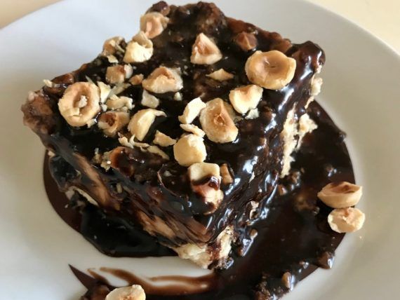 Επαναλαμβάνουμε την ίδια διαδικασία μέχρι να τελειώσουν η κρέμα και τα μπισκότα αρκεί η τελευταία στρώση να είναι στρώση κρέμας. Καλύπτουμε το γλυκό μας με το σιρόπι σοκολάτας και πασπαλίζουμε με χοντρό σπασμένα φουντούκια. Βάζουμε το γλυκό μας στο ψυγείο μέχρι να παγώσει και σερβίρουμε.
