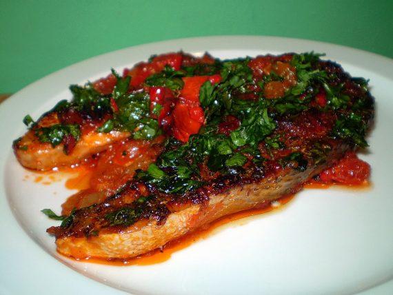 Εκτέλεση Σε αντικολλητικό τηγάνι ζεσταίνω το λάδι και τσιγαρίζω το κρεμμύδι με το σκόρδο, για 5 λεπτά. Σβήνω με το κρασί και αλατοπιπερώνω. Σε μερικά λεπτά ρίχνω την ντομάτα και την πιπεριά, σκεπάζω και χαμηλώνω την φωτιά. Σιγοβράζω για 15-20 λεπτά. Ρίχνω το μείγμα σε ταψάκι πυρέξ, βάζω από πάνω τις φέτες του σολομού, αφού προηγούμενα τις πλένω, στεγνώνω και αλατίζω ελαφρά. Με ένα κουτάλι βάζω επάνω στις φέτες μια μικρή ποσότητα από το μείγμα των κρεμμυδιών. Ψήνω σε προθερμασμένο φούρνο, στους 180 βαθμούς, για 45-50 λεπτά. Πασπαλίζω με τον μαϊντανό, σβήνω τον φούρνο και αφήνω μέσα το ταψάκι για 10 λεπτά ακόμα.