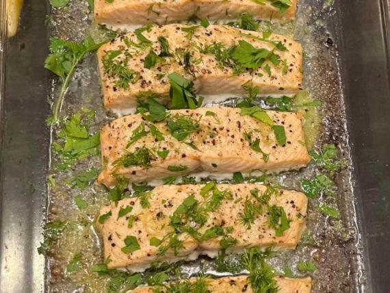 Συνταγή για σολομό ψητό στο φούρνο με μυρωδικά και χυμό λεμονιού, για ένα χορταστικό μεσημεριανό, κατάλληλο και για δίαιτα. Μπορούμε να το συνοδεύσουμε με μία πράσινη σαλάτα εποχής.