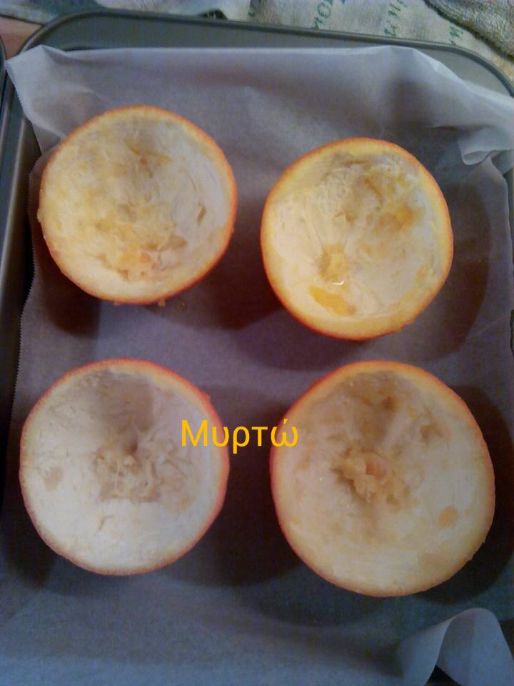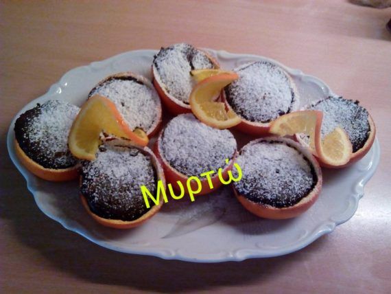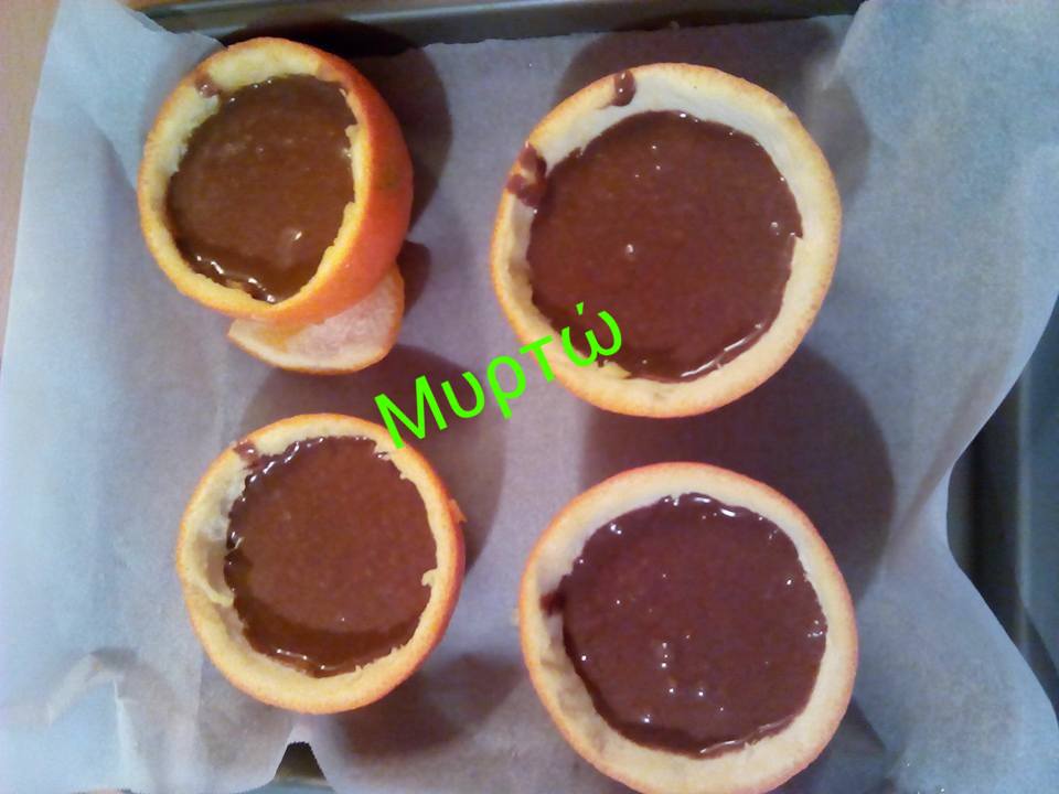 4 πορτοκαλια μεγαλα κομμενα στη μεση 2 αυγα Μισο φλυτζ ζαχαρη Μισο φλυτζ σπορελαιο Μισο φλυτζ γαλα Μισο φλυτζ χυμο πορτοκαλιου Ξυσμα από ένα πορτοκαλι 80 γρ κουβερτουρα λιωμενη σε μπεν μαρι 1 φλυτζ αλευρι 2 κ.σ. κακαο 10 γρ μπεικιν Κοβουμε τα πορτοκαλια στη μεση . Τα στιβουμε και αφαιρουμε με ένα μαχαιρακι το εσωτερικο που εχει απομεινει. Σε ένα μπολ χτυπαμε τα αυγα με τη ζαχαρη και προσθετουμε το γαλα, το σπορελαιο, το χυμο πορτοκαλιου και το ξυσμα. Στη συνεχεια προσθετουμε το αλευρι, το μπεικιν και το κακαο ,κοσκινισμενα, συνεχιζουμε το χτυπημα. Στο τελος προσθετουμε τη σοκολατα λιωμενη σε μπεν μαρι , στο μειγμα. Γεμιζουμε τα κουπακια μας, μεχρι τη μεση. Τα τοποθετουμε μεσα σε ταψακι και ψηνουμε στους 160β , αντιστασεις για μιση ωρα αν θελουμε να ειναι λιγο σφιχτα, σαν κεικ ή στο μισο χρονο ,αν θελουμε να ειναι ρευστο το μεσα!!!.