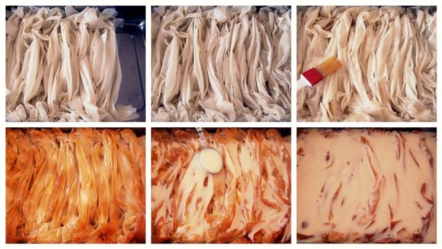 Λαδώνουμε ένα ορθογώνιο ταψί (διαστάσεων 35×25). Ανοίγουμε τα φύλλα κρούστας στον πάγκο εργασίας μας, τα σουρώνουμε ένα-ένα και τα τοποθετούμε στο ταψί. Δεν τα πιέζουμε, θέλουμε να είναι αφράτα. Τα λαδώνουμε με σπορέλαιο σιγά-σιγά με ένα πινέλο. Βάζουμε το ταψί στο φούρνο και ψήνουμε τα φύλλα μέχρι να ροδίσουν.