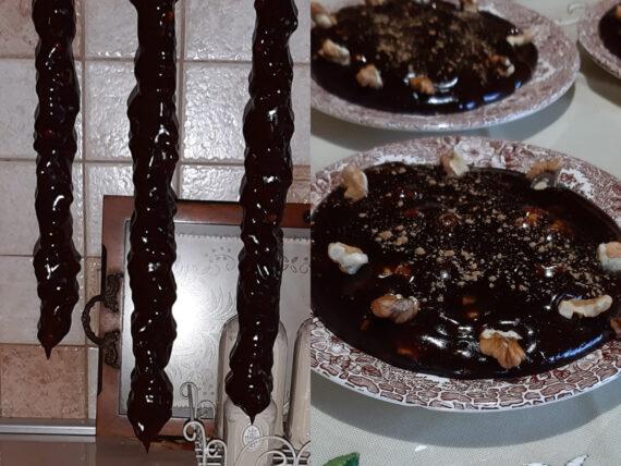 Μόλις πήξει αρκετά κατεβάζουμε την κατσαρόλα από την φωτιά και βουτάμε βουρλιές με καρύδια μέσα στο πετιμέζι. Οι βουρλιές είναι καρύδια δεμένα μεταξύ τους με σπάγκο. Βοηθάμε με το κουτάλι της σούπας να πάει παντού, σηκώνουμε και κρεμούμε τις βουρλιές μέχρι να πήξει καλά.