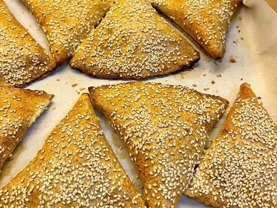 Τα διπλώνουμε προς το κέντρο του ημικύκλιου και πατάμε τα σημεία που έχουν την αλευρόκολλα για να κολλήσουν. Τα αλείφουμε με κρόκο αυγού και τα πασπαλίζουμε με σουσάμι. Ψήνουμε σε ένα ταψί με λαδόκολλα, στους 180 βαθμούς Κελσίου για 25 λεπτά.