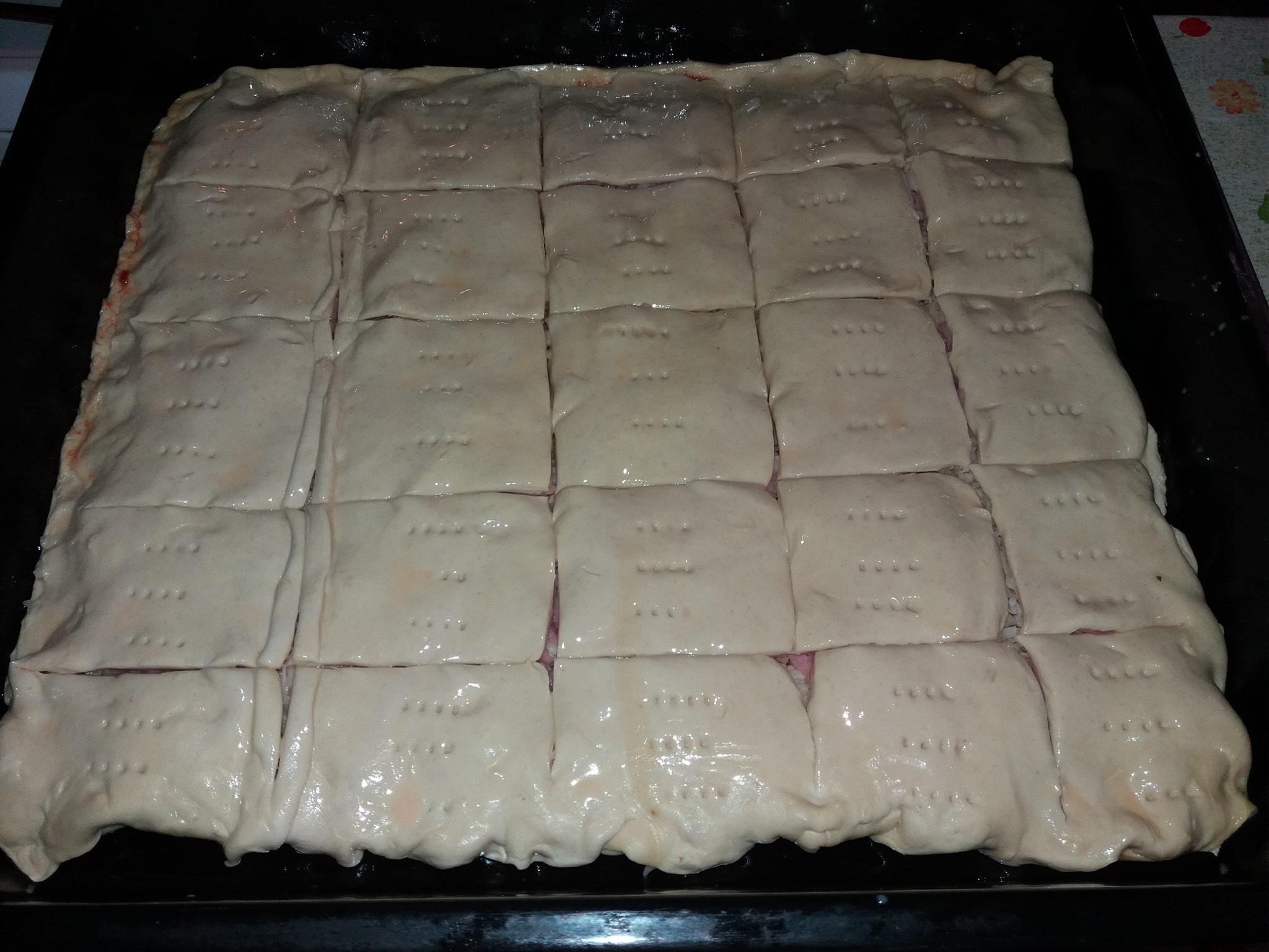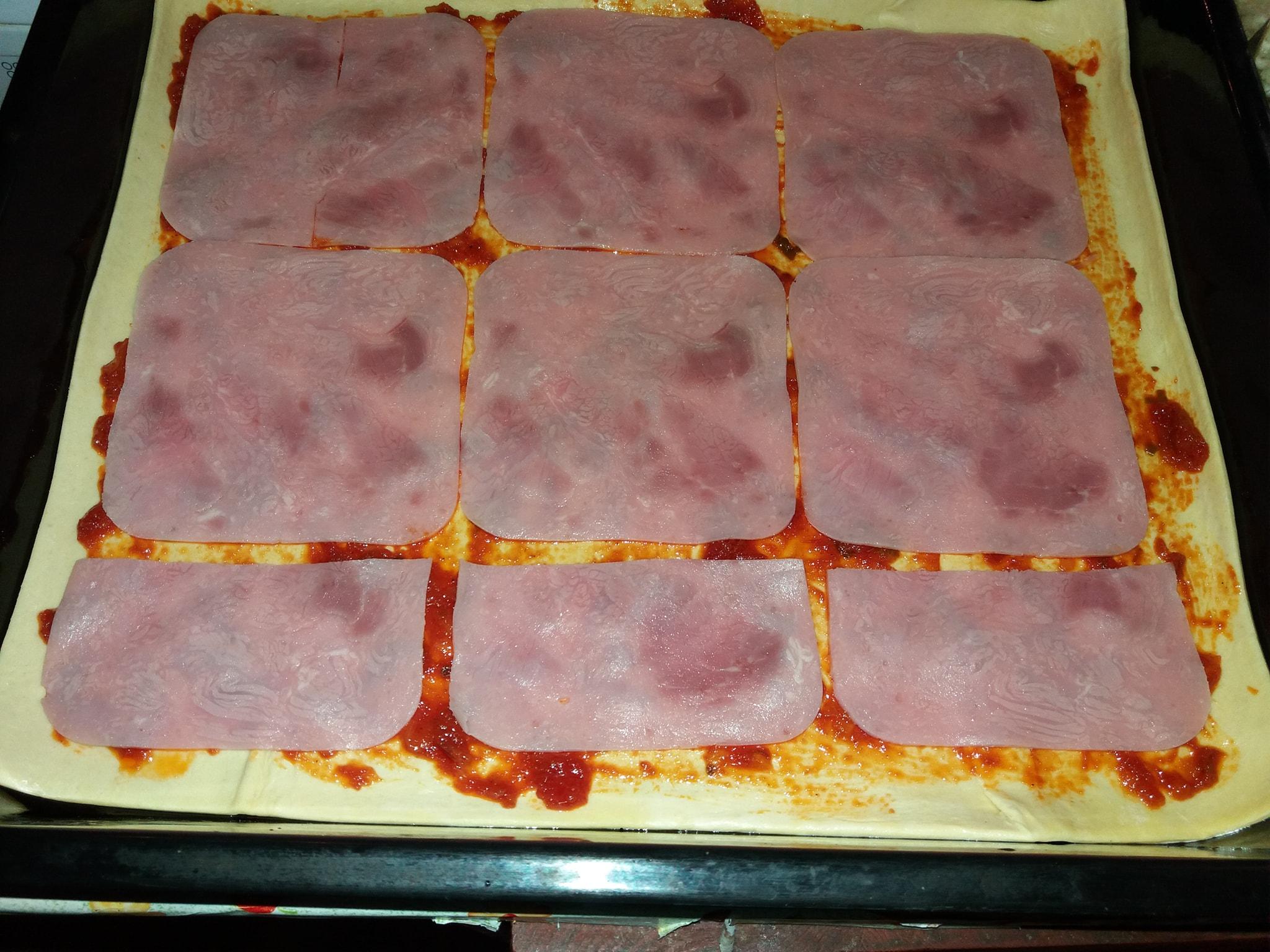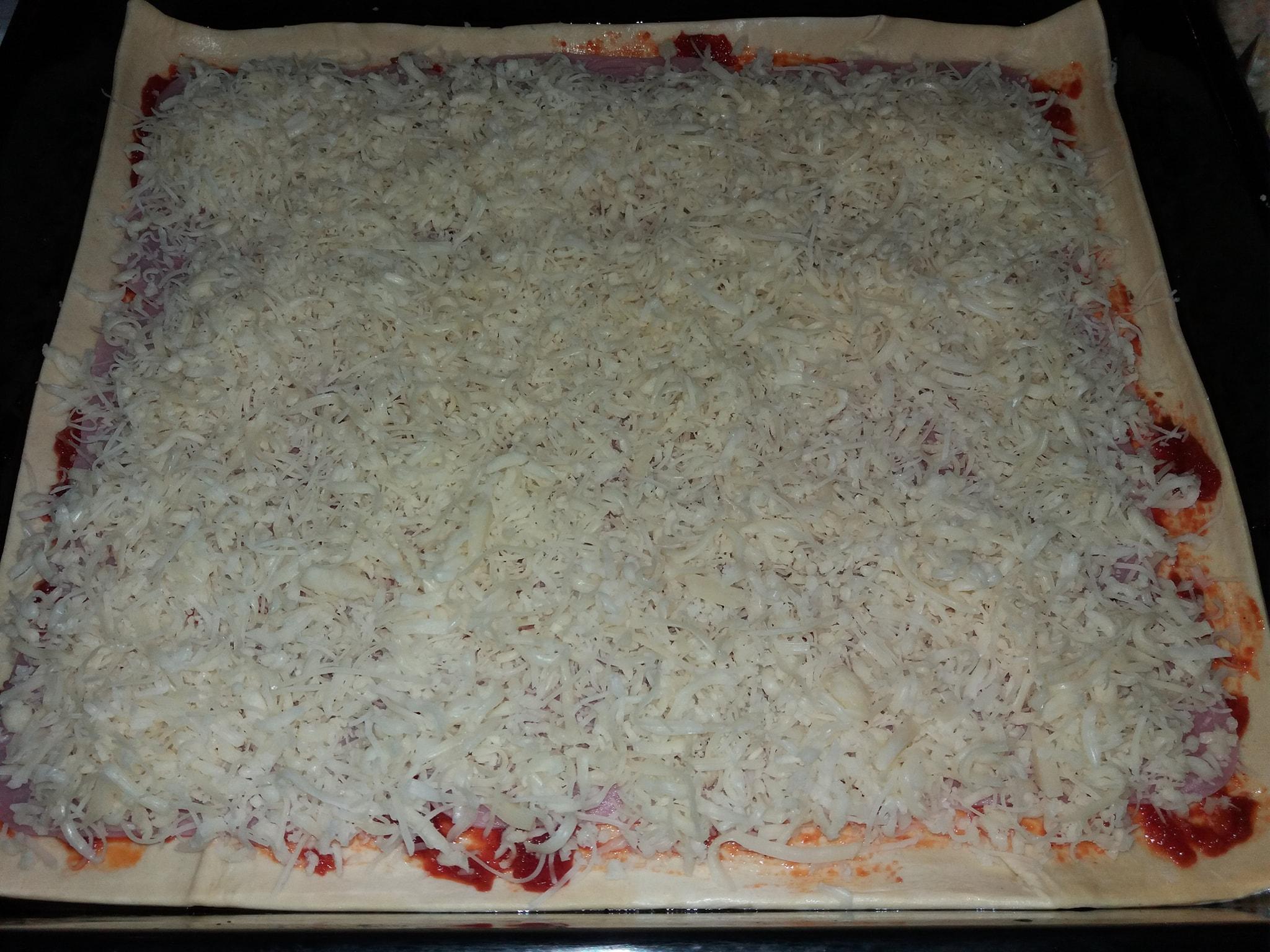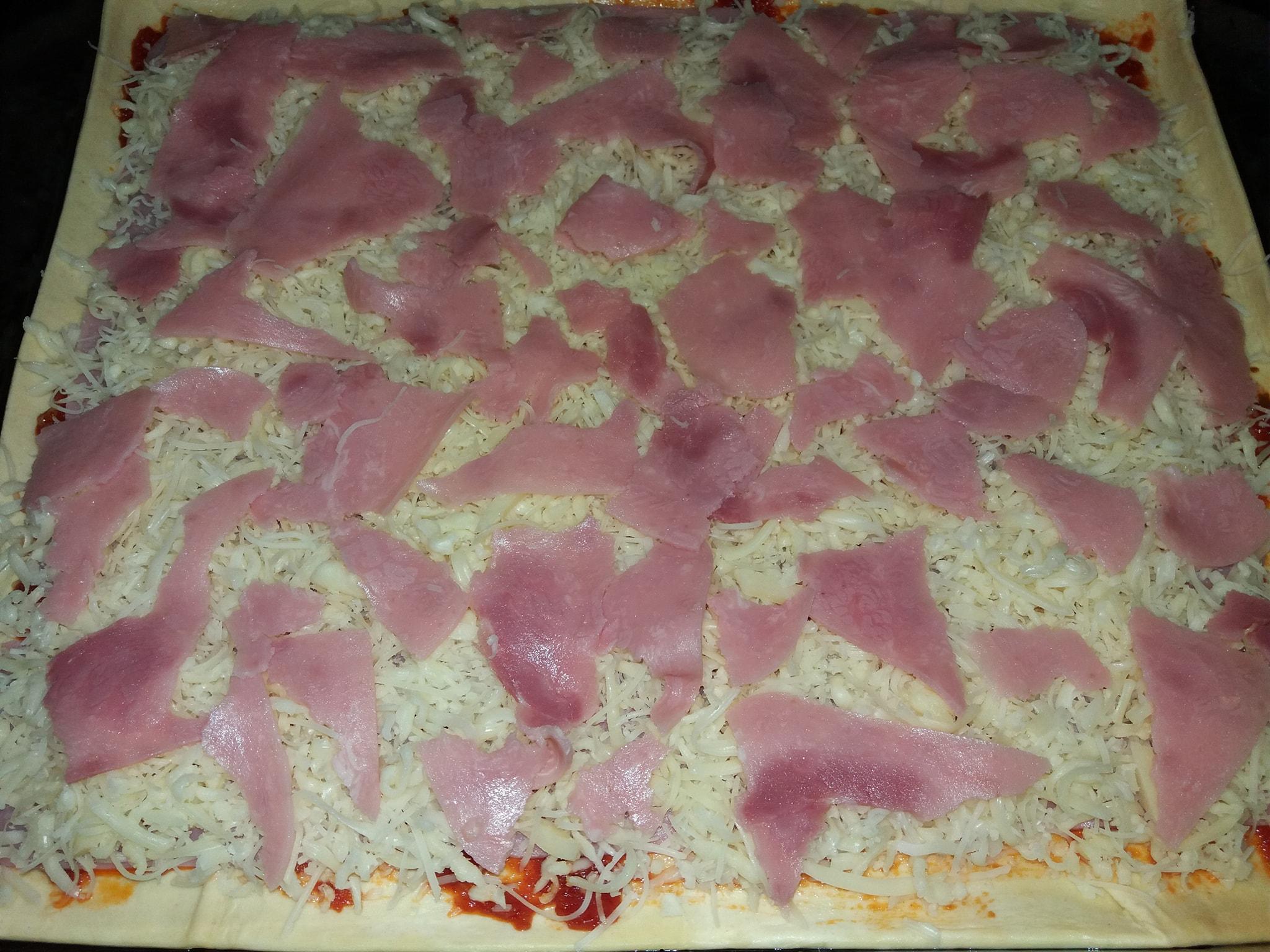 Σε ένα λαδωμένο ταψάκι βάζουμε το ένα φύλλο σφολιάτας, αλείφουμε με την σάλτσα ντομάτας, προσθέτουμε το ζαμπόν, έπειτα το μπέικον σε κομματάκια, το τυρί και έπειτα καλυπτούμε με το 2ο φύλλο σφολιάτας και σφραγιζουμε τις άκρες καλά.Χαράζουμε σε κομμάτια και αλείφουμε με το αυγό που έχουμε χτυπήσει.Ψήνουμε για 20 λεπτά στην μεσαία σχάρα και για άλλα 20 λεπτά στην πιο χαμηλή σχάρα.Όταν το βγάλουμε από τον φούρνο, το αφήνουμε να κρυώσει για τουλάχιστον 20 λεπτά. Καλή όρεξη!
