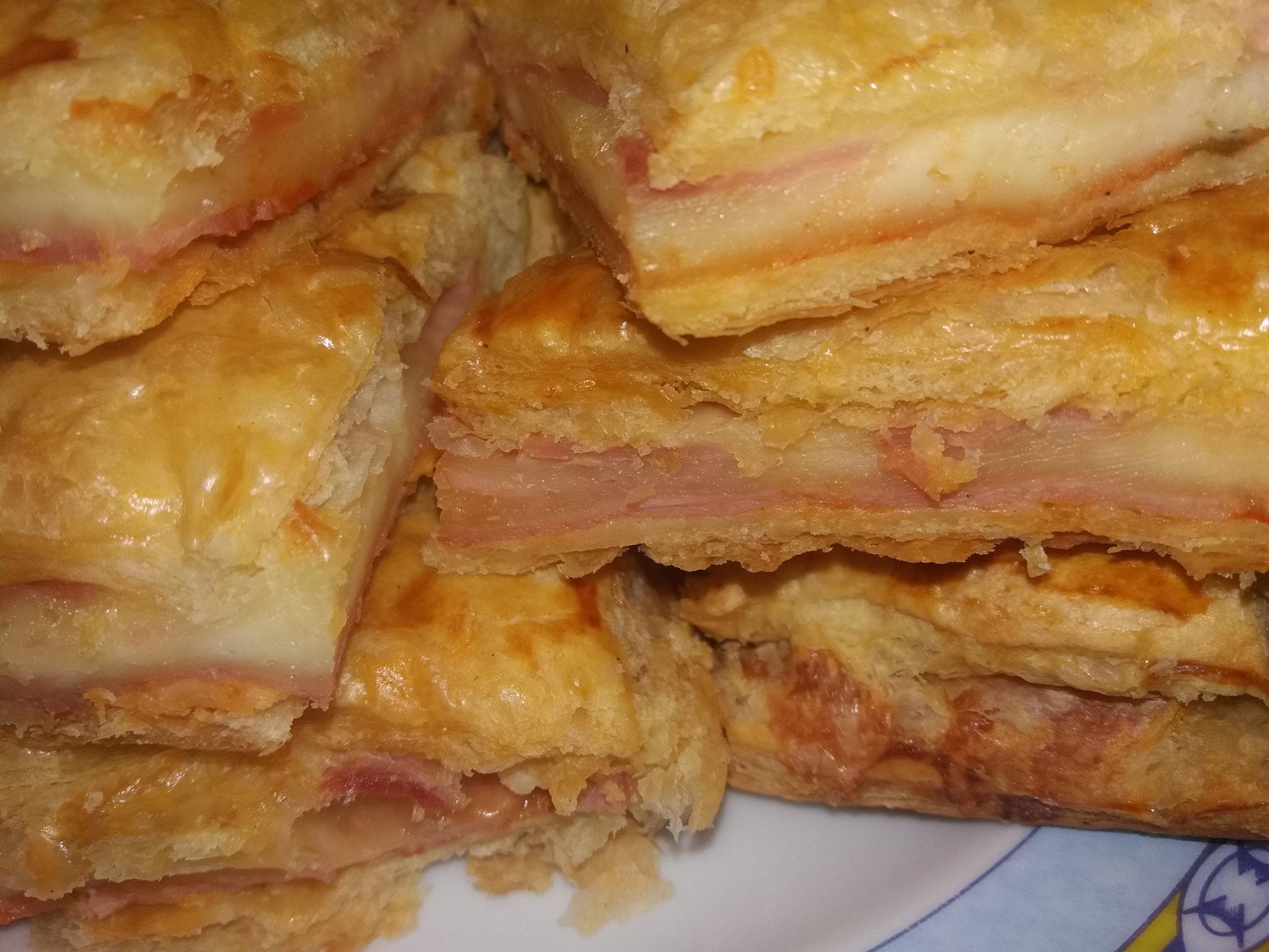 1 συσκευασία σφολιάτας (2 φύλλα) 6 μεγάλες φέτες στρογγυλό ζαμπόν της επιλογής σας 150 γρ γκούντα τριμμένο 150 γρ έμενταλ 2 φέτες μπέικον (προαιρετικά) 1 αυγό