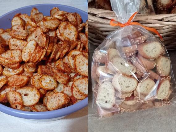 Αν τα φτιάξουμε με ελαιόψωμο, μπορούν να γίνουν και με γεύση ελιά. Μπορούμε να χρησιμοποιήσουμε και καπνιστή πάπρικα. Αν τα βάλουμε σε σακουλάκια διατηρούνται μέχρι και 2 εβδομάδες αρκεί να είναι κλεισμένα καλά τα σακουλάκια.