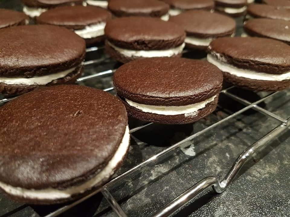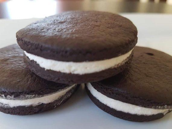 Μόλις έχουν κρυώσει τα δισκάκια κάνετε τη συναρμολόγηση. Παίρνετε ένα δισκάκι και από τη μεριά που ακουμπούσε στο ταψί βάζετε στη μέση κρέμα, τοποθετείτε ένα άλλο δισκάκι η μεριά που ακουμπούσε στο ταψί να ενωθεί με τη κρέμα και πιέζεται να κλείσει λίγο. Με ένα μαχαίρι παίρνετε γύρω γύρω τη περίσσια κρέμα. Συνεχίζετε μέχρι να τελειώσουν τα δισκάκια. Αν περισσέψει κρέμα, τη βάζετε στο ψυγείο και την χρησιμοποιείτε σε άλλο γλυκό. Καλή επιτυχία!!!