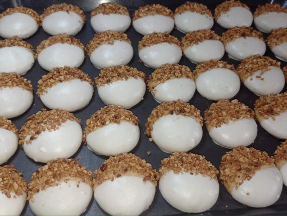 Συνταγή για τραγανά μπισκότα με γλάσο λευκής σοκολάτας και φιστίκια για κέρασμα στο γάμο με τα πιο οικονομικά υλικά. Σαν αγοραστά.