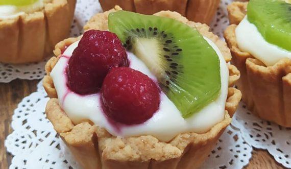 Η βάση και η κρέμα γι’ αυτά τα ταρτάκια είναι σπιτική! Η βάση φτιάχνεται με αλεύρι, ζάχαρη, βούτυρο και μερικά ακόμη απλά υλικά και είναι τραγανή και μυρωδατή όπως ακριβώς και στα ζαχαροπλαστεία.