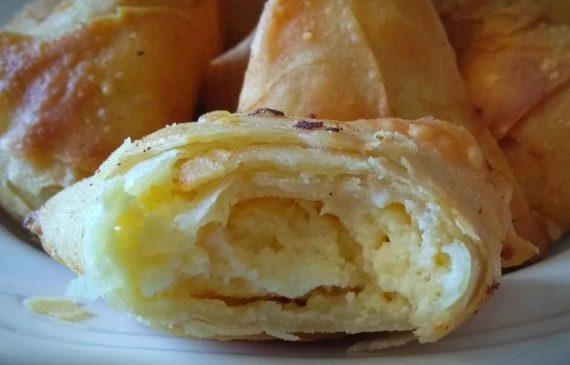 Εκτέλεση Βάζω το γάλα στη φωτιά και όταν ζεσταθεί καλά ρίχνω βροχιδων το σιμιγδάλι μου ανακατεύοντας . Συνεχίζω το ανακάτεμα μέχρι να βράσει και να πήξει η κρεμούλα . Αποσύρω από την φωτιά ,προσθέτω το βούτυρο , σκεπάζω και αφήνω να έρθει σε θερμοκρασία δωματίου. Όταν κρυώσει προσθέτω τα αβγά,τα τυριά και αλατοπιπερωνω. Φτιάχνω το ζυμαράκι μου ,αφήνω λίγο να ξεκουραστεί και χωρίζω σε 5 -6 μπαλίτσες. Ανοίγω λεπτό φύλλο και κόβω σε λωρίδες. Γεμίζω μια μια λωρίδα με μια αρκετά γεμάτη κ.γ γέμιση( να είναι πλούσια) και κλείνω σε τρίγωνα. Τηγανίζω σε καυτό λάδι κατά προτίμηση ηλιέλαιο ή ψήνω στο φούρνο μου μέχρι να ροδίσουν.
