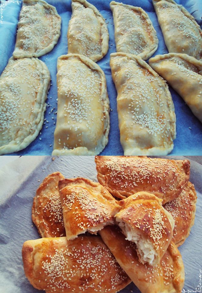 Εκτέλεση Σε μια λεκάνη ρίξτε πρώτα το λάδι, το γάλα, την μαργαρίνη, τα αυγά, το αλάτι, και το μπέικιν,ανακατέψτε λίγο με το σύρμα και ρίξτε σταδιακά το αλεύρι. Φτιάξτε μια ωραία και μαλακή ζύμη. Αφήστε μόνο για 10 λεπτά να ξεκουραστεί το μείγμα. Ανοίξτε πίτες με τον πλάστη σας και γεμίστε με το τυρί, κλείστε και διπλώστε αλείφετε με αυγό και πασπαλίζετε με σουσάμι, ψήνετε σε προθερμασμένο φούρνο στους 180 βαθμούς για 25 με 30 λεπτά.