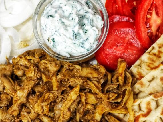 Όσο για τα υπόλοιπα υλικά… έφτιαξα απλά μια εύκολη σως γιαουρτιού σόγιας με μυρωδικά, έκοψα μια πίτα για σουβλάκι στα τέσσερα και την ζέστανα στην τοστιέρα και πρόσθεσα στη μερίδα μου, κρεμμύδι και ντομάτα.