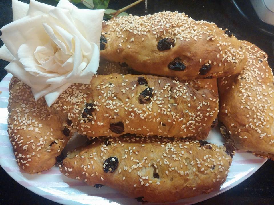 1 φλυτζ. ζάχαρη 2 φλυτζ. χυμό πορτοκαλιού 2 φακ . σταφίδα 2 φακ ξηρη μαγια 1φλ. λάδι 1 φλυτζ. χλιαρό νερό 1 κ γ γαρυφαλλο σε σκονη 1 κ γ κανελα 1 κ σ ποτο μαστιχα αλευρι οσο σηκωσει 1 κ γ μελι για αλειμμα με νερο στο τελος σουσαμι
