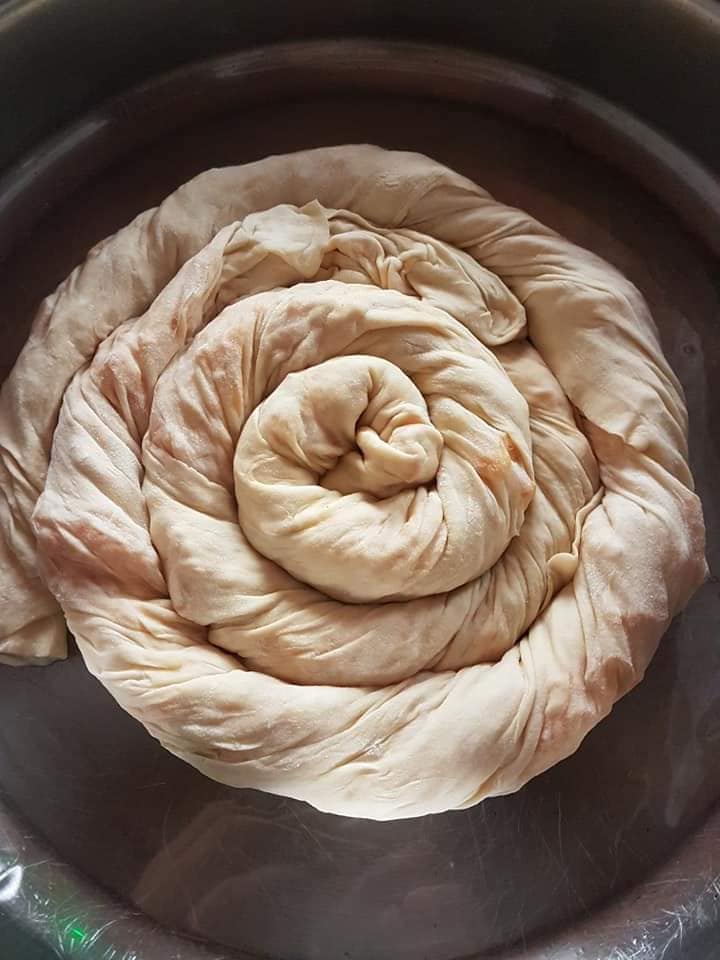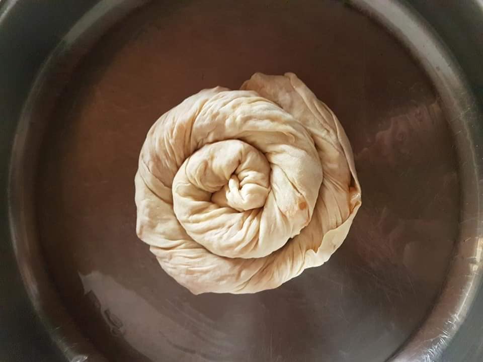 Ανακατεύω όλα τα υλικά για τη ζύμη και τη χωρίζω σε 4 μπαλάκια. Τα αφήνω σε ένα μπολ σκεπασμένα με μεμβράνη και μετά τυλιγμένα σε μία κουβερτούλα για 30 λεπτά. Κάθε μία μπάλα ανοίγω σε φιλώ ραντίζω με λίγο λαδάκι βάζω από το λάχανο και τυλίγω σε ρόλο και μετά σε σαλιγκάρι στο λαδωμένο ταψί.